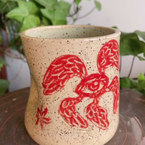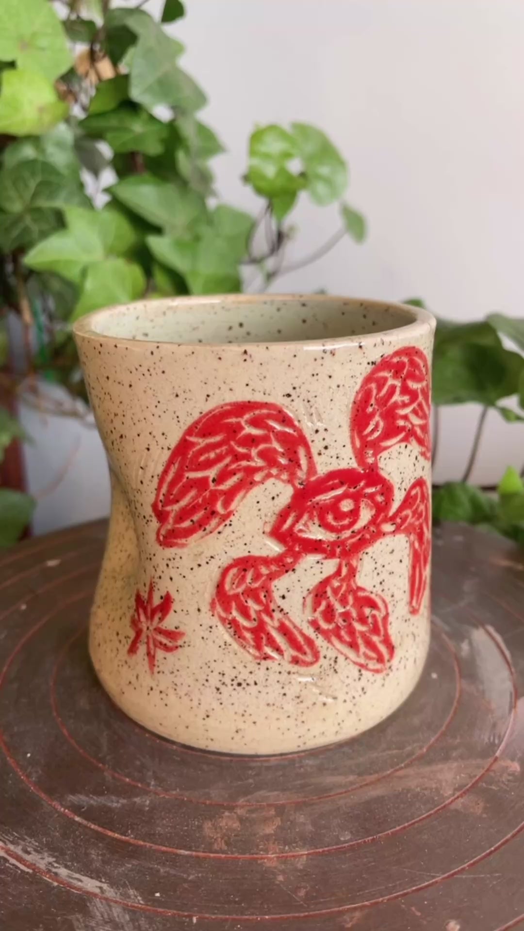 I carve the designs directly into the clay, creating a natural contrast between the warm, speckled stoneware and the detailed carved lines. Each mug is then glazed with interior colour a little surprise of joy with every sip!