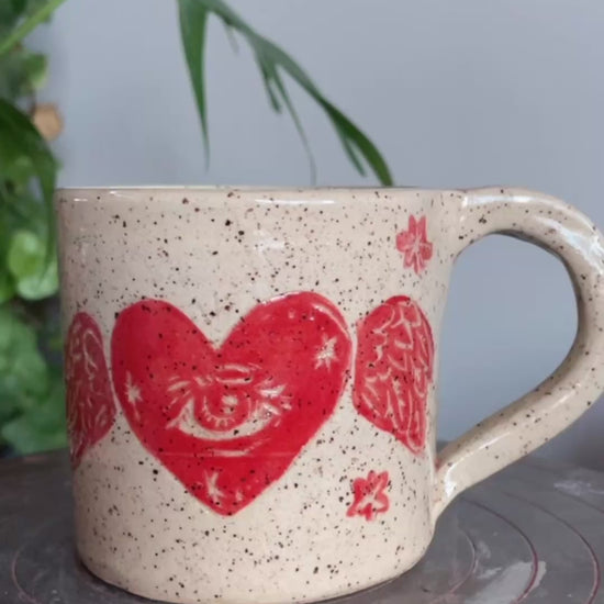 I carve the designs directly into the clay, creating a natural contrast between the warm, speckled stoneware and the detailed carved lines. Each mug is then glazed with interior colour a little surprise of joy with every sip!
