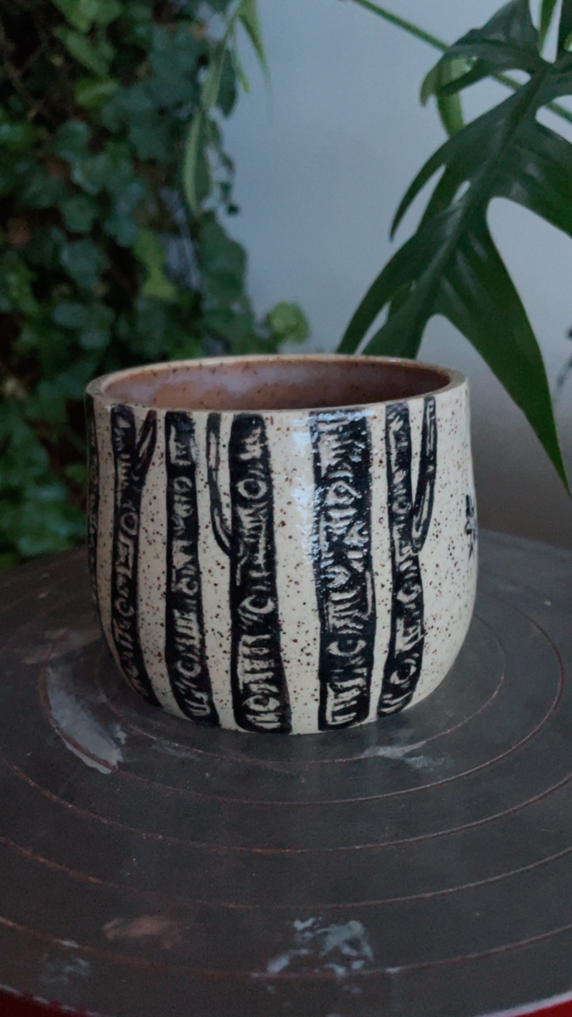 I carve the designs directly into the clay, creating a natural contrast between the warm, speckled stoneware and the detailed carved lines. Each mug is then glazed with a, earthy interior colour a little surprise of joy with every sip!