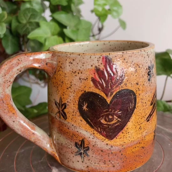 I carve the designs directly into the clay, creating a natural contrast between the warm, speckled stoneware and the detailed carved lines. Each mug is then glazed with interior colour a little surprise of joy with every sip!