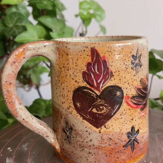 I carve the designs directly into the clay, creating a natural contrast between the warm, speckled stoneware and the detailed carved lines. Each mug is then glazed with interior colour a little surprise of joy with every sip!